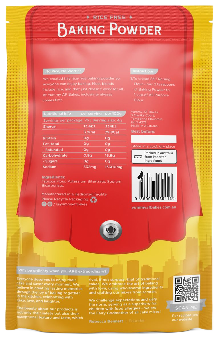 No rice? No worries. Our Rice-Free Baking Powder is designed so everyone can enjoy worry-free baking. Delivering the perfect lift to cakes, muffins, pancakes, and breads, this blend guarantees a soft, tender crumb every time. At Yummy AF Bakes, inclusivity always comes first—because everyone deserves a slice of joy.